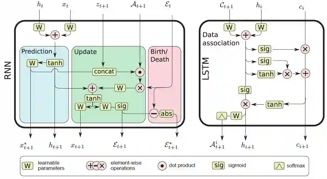 左:用于目标状态预测的RNN;右:用于数据关联(匹配)的LSTM(图片来源:[23])
