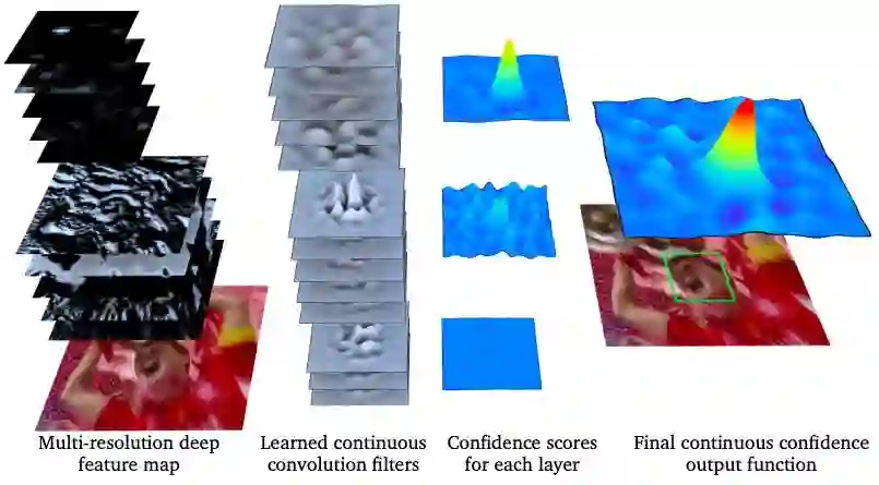 C-COT的特征图、卷积核、各层置信图和融合后连续空间的输出置信图(图片来源:[6])