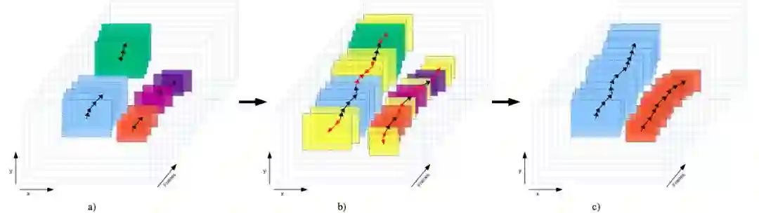 但是!把希望全寄托于目标检测器是不行的。所以作者一年之后又推出了V-IOU Tracker[22])(AVSS18, E. Bochinski, et al.)。一方面,当一个tracklet无法匹配到相应的检测框时,不再简单地认为目标离开了视野,而是在此时启动一个单目标跟踪器来尝试继续跟踪这个目标,直到 ttl(Time to Live)时间之后。另一方面,当一个新tracklet被创建时,先启动一个单目标跟踪器尝试在之前的 ttl 帧中寻找该目标。如果新的tracklet和已完成的track能够通过IOU匹配起来,就将他们合并处理。(如下图中的红色箭头,注意其方向)