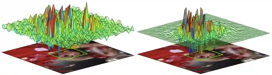话说回来,互相关运算让我们得以衡量 h 与 f 的相似度,换句话说,互相关得到的响应图中每个像素的响应高低代表着每个位置相似度的高低。假设目标存在于新一帧图像 f 中的话,那么在 h 和 f 对得最齐的地方就应该是目标中心的位置了!