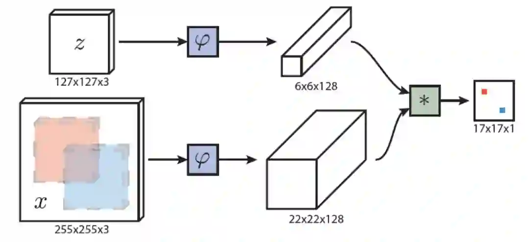 (好图呀!不仅画得令人赏心悦目,还很清楚地传达了孪生网络的基本思想)图中的 φ 就是CNN编码器,上下两个分支使用的CNN不仅结构相同,参数也是完全共享的(说白了就是同一个网络,并不存在孪生兄弟那样的设定)。z 和 x 分别是要跟踪的目标模版图像(尺寸为127x127)和新的一帧中的搜索范围(尺寸为255x255)。二者经过同样的编码器后得到各自的特征图,对二者进行互相关运算后则会同样得到一个响应图(尺寸为17x17),其每一个像素的值对应了 x 中与 z 等大的一个对应区域出现跟踪目标的概率。