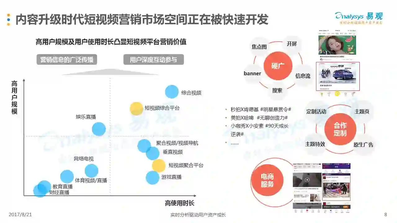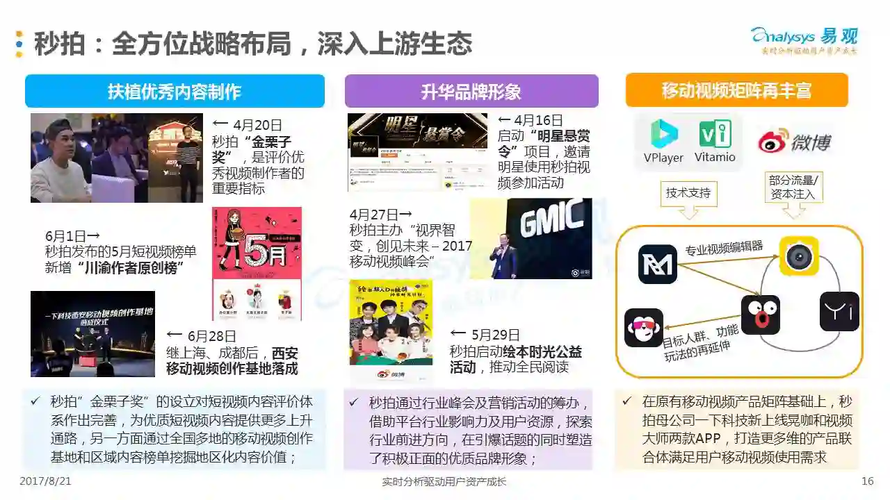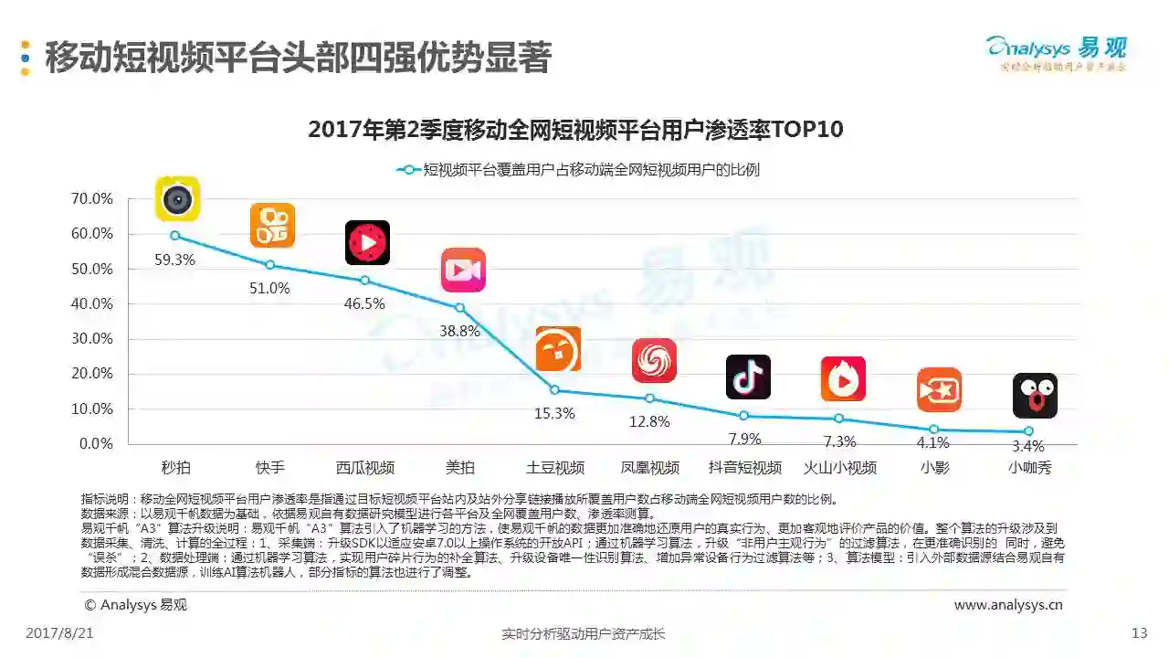 进入2017年以来,短视频持续成为市场各方关注的中心,行业规模持续攀升。在2017年第2季度,短视频领域在政策监管、企业布局、产业环节、产品创新、广告营销等多个层面都涌现出新的发展热点,本分析从行业现状热点出发,分析短视频市场主要环节和典型厂商,并对下阶段市场发展趋势作出展望。