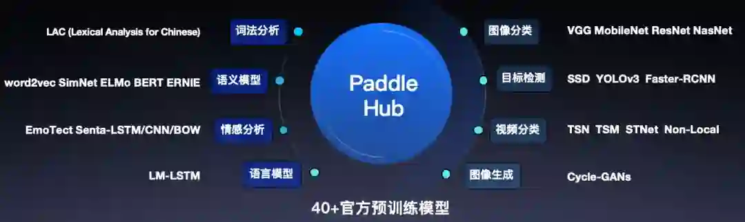 全新的PaddleHub模型和任务更加丰富,为用户提供了覆盖文本、图像和视频三大领域八大任务的40+预训练模型,同时还在飞桨官网上开辟了PaddleHub的网页。