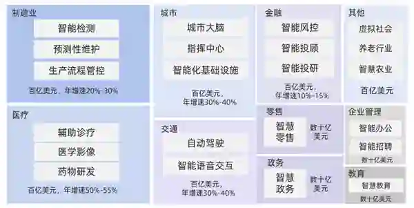 在全球范围内,各行各业都在拥抱人工智能,被其高度赋能、深度渗透。根据 CB Insights、德勤等机构预测数据,2021 年全球人工智能市场规模达千亿美元级别,主要应用场景为医疗、金融、城市、教育、制造等。