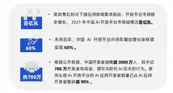 受下游应用需求及宏观政策红利推动,近几年中国开放平台市场规模稳步增长。2021 年中国 AI 开放平台市场规模达百亿元,预计未来五年,中国 AI 开放平台市场年复合增长率有望达到 60% 。