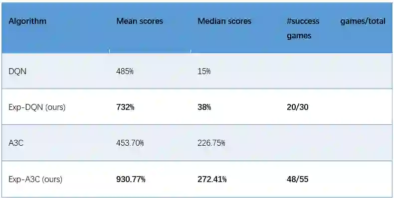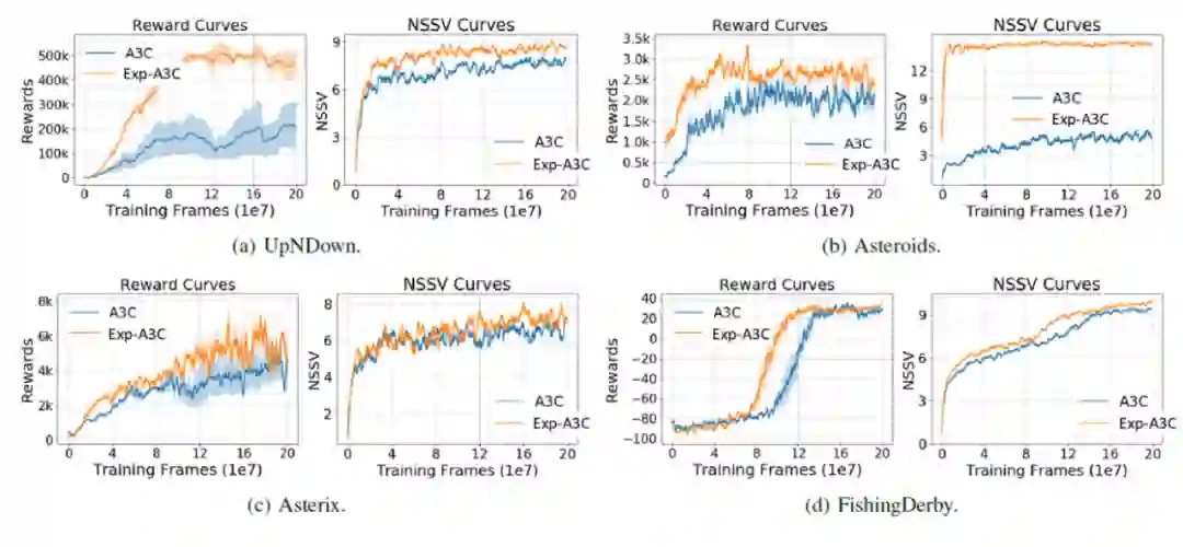 我们在 Atari game 上验证了所提出算法的有效性。表1给出了算法 Exp-DQN 和 Exp-A3C 在 Atari game 上的表现。平均来看,它们可以取得更高的分数,并且 Exp-DQN 在20个(共30)游戏中打败了 DQN,Exp-A3C 在48个(共55)游戏中打败了 A3C。图6给出了训练过程中 A3C 和 Exp-A3C 算法的 NSSV 和 Reward 曲线。可以看出 Exp-A3C 有效地增大了 NSSV,并且提升了算法在 Atari game 上的表现。以上实验结果验证了 Exp-DRL 这类算法的有效性。
