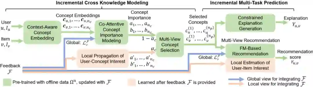 在整合用户反馈时,我们提出了一种多视角的方法使模型的增量更新过程更加有效。其中第一个视角从泛化能力出发,通过更新模型的全局(global)参数吸收用户反馈,降低误差;第二个视角从用户满意度出发,以局部传播(local propagation)的方式更直接地满足用户的反馈意见。