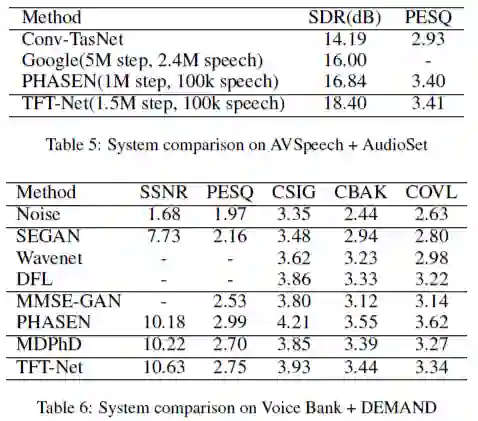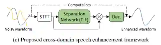 本篇论文提出了一种跨域的方法来充分利用这两类方法的优点。它的特点是从输入的含噪声的时频域信号,端到端可学的预测出不含噪声的时域信号。如图8所示,系统的前半部分与标准的时频域方法一样,对时频域信号进行处理,因而可以利用语音和噪声在语谱图中的结构信息。系统的后半部分类似于时域的方法,首先用一个可学的解码器将时频域信号转换成时域信号,然后与监督信号计算损失函数。这样一个端到端可学的系统就避免了时频域方法的缺点。