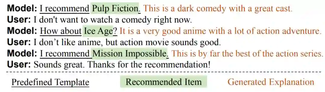 因此我们提出了可解释对话推荐(explainable conversational recommendation)任务,系统籍由解释引导用户反馈,并进行整合、吸收,产生新的结果,以系统-用户对话的形式迭代地提升推荐和解释效果(如图10、11所示)。相比于现有的对话推荐模型设计问题收集用户答案的方式,可解释对话推荐用户自主反馈的方式不仅能保证模型的可解释性,也为用户减轻负担,更加友好。