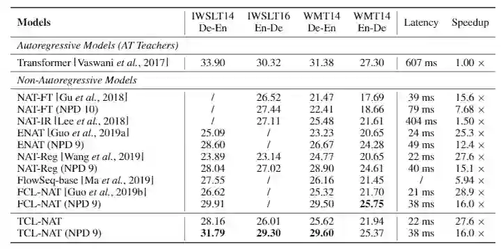 实验表明,与以前的 NAT 基线相比,TCL-NAT 显着提高了翻译精度,并将 NAT 和 AT 模型之间的性能差距降低到1-2 BLEU,这说明了我们提出的方法的有效性。