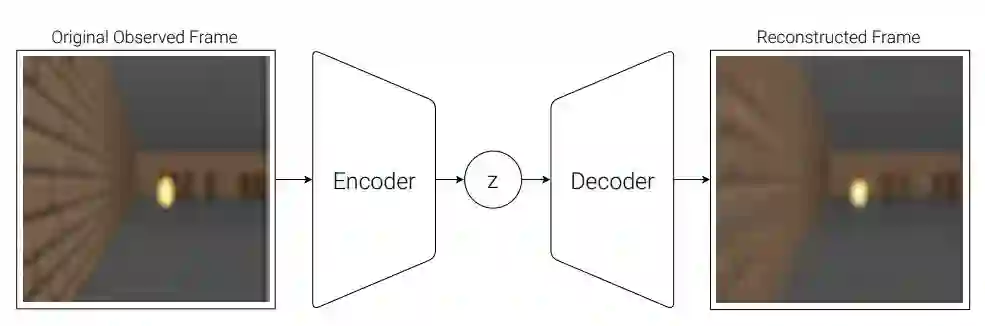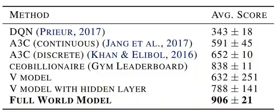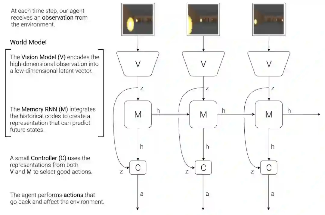 我们提出一种由人类认知系统启发而来的简单模型。在该模型中,我们的智能体有一个视觉感知模块,可以把所见压缩进一个小的表征性代码。它同样有一个记忆模块,可以根据历史信息对未来代码做预测。最后,智能体还有一个决策模块,只基于由其视觉和记忆组件创建的表征来制定行动。