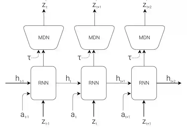 3. 训练 MDN-RNN(M)建模概率分布 P(z_{t+1} | a_t, z_t, h_t)。