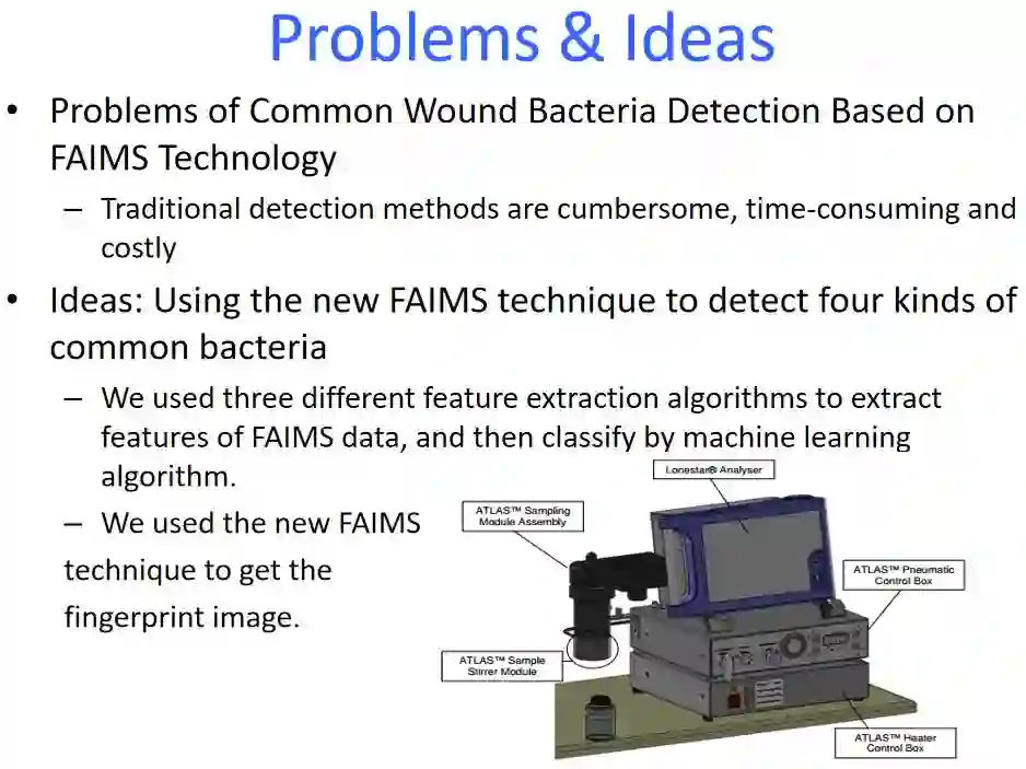 在临床实践中,医生普遍关注的问题是各种类型的伤口感染容易导致病人死亡、致残和经济负担。快速、可靠地检测出感染性细菌是后续治疗的关键,也成为当今研究热点之一。本文利用高场不对称离子迁移谱检测技术(FAIMS),对金黄色葡萄球菌等四种常见的伤口感染细菌进行区分。并对不同特征提取方法与学习器在伤口感染细菌分类问题上的性能,进行了比较分析。