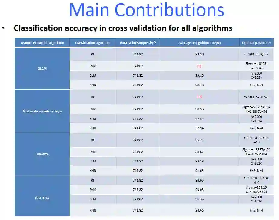 采用灰度共生矩阵(GLCM)、基于主成分分析的局部二进制模型(PLBP)和多尺度小波能量(MSWE)三种特征提取算法进行特征提取;采用随机森林(RF)、K最近邻(KNN)、极限学习机(ELM)和支持向量机(SVM)进行细菌样本的分类。实验结果表明,GLCM和多尺度小波能量的特征提取方法能够较好的提取出区分不同细菌样本的特征。随机森林和支持向量机均表现出了较高的识别性能。其中,以多尺度小波能量(MSWE)进行特征提取,以随机森林算法作为分类模型的组合方法达到了100%的识别率;以灰度共生矩阵(GLCM)进行特征提取,以支持向量机(SVM)作为分类模型的组合方法也达到了100%的识别率本。