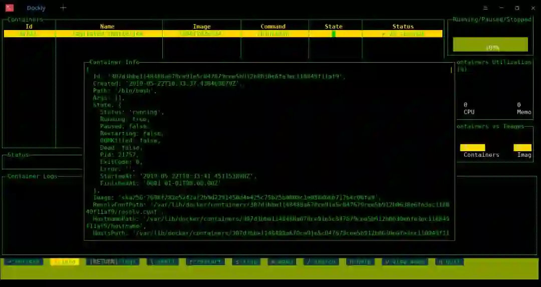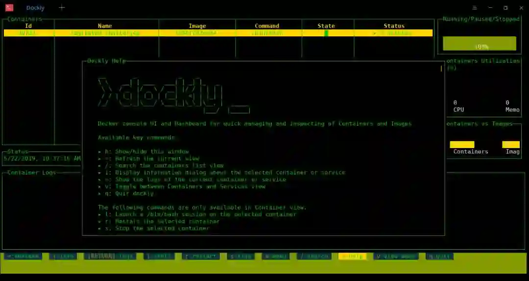 在底部,有少量的键盘快捷键来执行各种 Docker 管理任务。以下是目前可用的键盘快捷键列表: