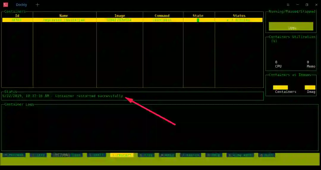 如果你想随时重启容器,只需选择它并按 r 即可重新启动。