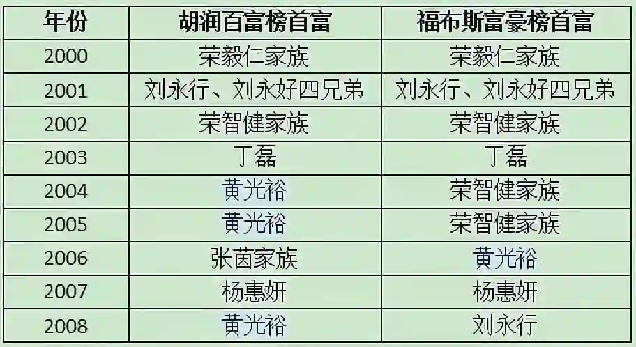 2004、2005、2008年,30多岁的黄光裕三度问鼎胡润大陆百富榜,并在2006年福布斯中国富豪榜排名第一。