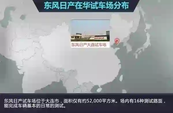 很少有人知道日产在华也有试车场。该试车场位于东风日产大连工厂内。有“雷诺日产联盟工厂功能最强试车场”之称。整个试车场占地面积约5.2万平方米,有16种测试路面和直线距离900米测试跑道,能够充分检验车辆各项动态性能。