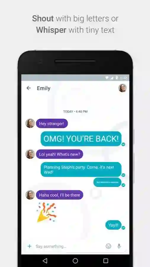 除此之外呢,Allo还有一个特别好玩的应用,就是对话框内输入文字之后,只需要上下拖动发送按钮,发送的文字大小就会跟着改变,网上拖就是放大文字,往下拖就是缩小。