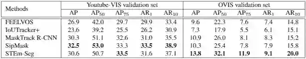 研究者在 OVIS 上尝试了 5 种开源的现有算法,结果如下表所示。可以看到 OVIS 非常具有挑战性。使用同样的评价指标,MaskTrack R-CNN 在 Youtube-VIS 验证集上 mAP 能达到 30.3,在 OVIS 验证集上只有 10.9;SipMask 的 mAP 也从 Youtube-VIS 上的 32.5 下降到了 OVIS 上的 10.3。5 个现有算法中,STEm-Seg 在 OVIS 上效果最好,但也只得到了 13.8 的 mAP。