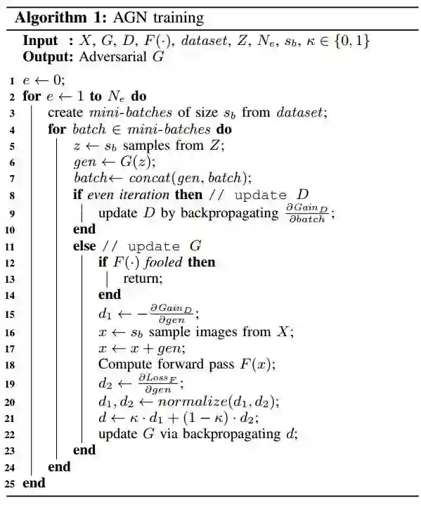 训练 AGN 的算法如算法 1 所示。该算法的输入是一组良性样本 (X)、一个预初始化的生成器和鉴别器、一个将被欺骗的神经网络、一个真实样本数据集(生成器的输出应该与其中的样本很像)。