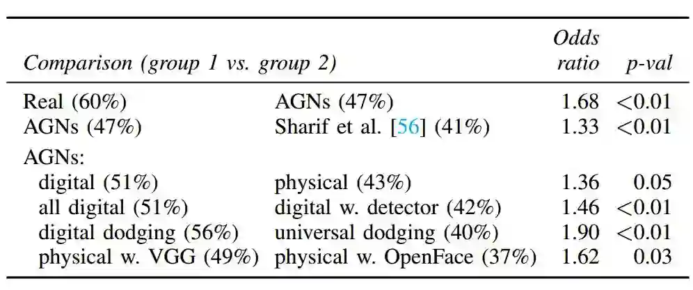 表 7:所选择的眼镜集合对的相对真实度。对于每两个集合之间的比较,我们都在括号中报告了每组中被研究参与者标记为真实的眼镜的比例;另外还报告了组之间的比值比(odds ratio)以及 χ2 独立性测验的 p 值。