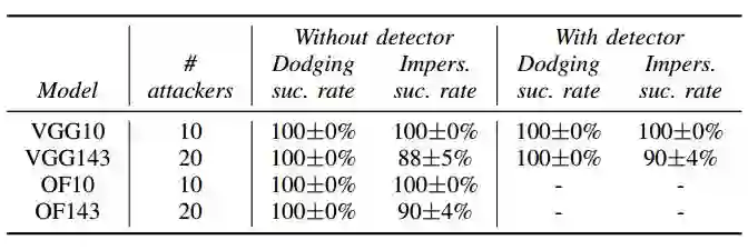 表 1:本研究中所用的神经网络的架构。对于 OpenFace 和 VGG DNN,我们仅报告了为基础、特征提取、DNN 增加的层。Conv 指卷积,Deconv 指去卷积(也叫做转置卷积),FC 指全连接层,Flatten 指矩阵的向量化,LrB 指后面跟着一个 leaky 整流线性层的批规范化,LReLu 指 leaky 整流线性层,MP 指最大池化层,RB 指后面跟着一个整流线性层的批规范化,tanh 指双曲正切。G 和 D 中所有的卷积和去卷积都使用了 5×5 过滤器,步长和填充为 2。检测器的卷积使用的 3×3 过滤器,步长为 2,填充为 1。检测器的 MP 层的窗口大小为 2×2,步长为 2。