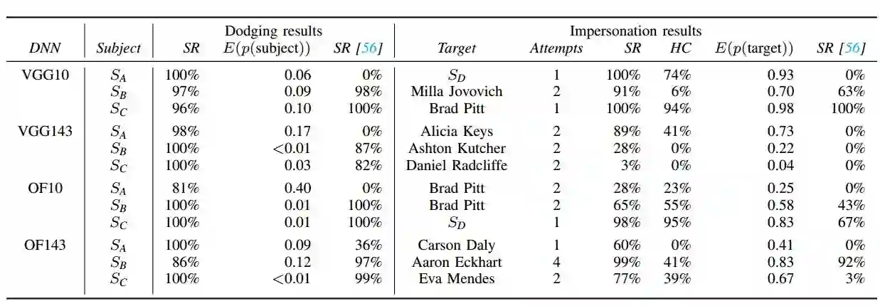 表 4:实体可实现性实验的总结。前两列给出了被攻击的 DNN 和攻击者。