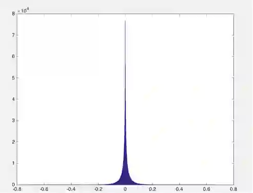 对于 NLP 任务,目前已有的深度神经网络模型中动辄应用百万量级词典,其中 embedding 层的参数占整个模型的绝大部分,所以解决模型内存消耗首先从 embedding 层入手。图 1 是用于相关性排序系统中卷积神经网络模型的 embedding layer 参数的值域分布图:
