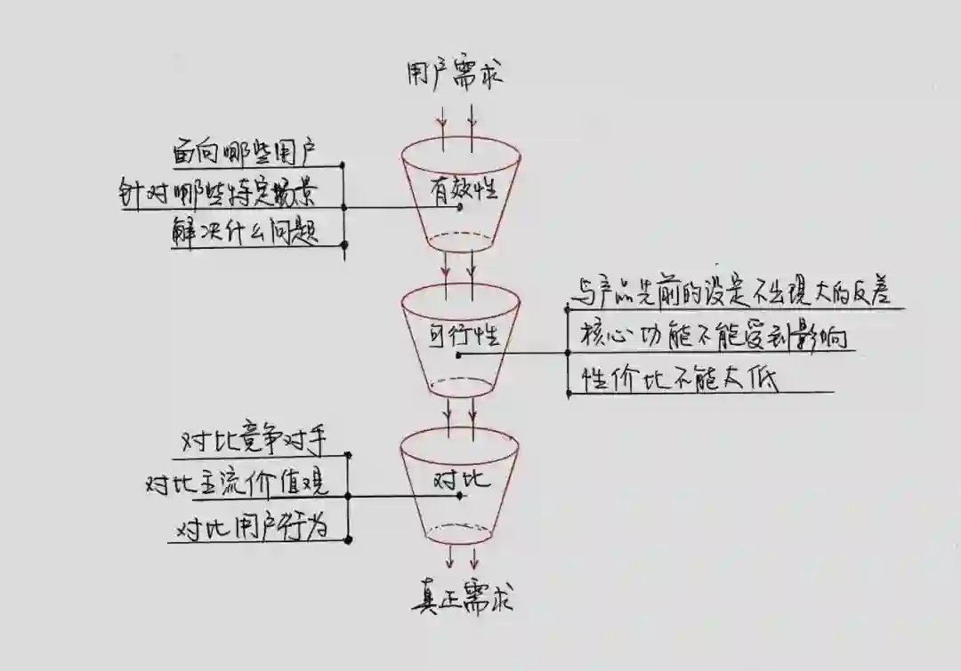 真正的用户需求需要通过充分地收集用户诉求,然后观察、调研,分析用户使用场景,进而发现其中可优化的点(痛点、爽点),最终筛选、提炼出真实的需求。