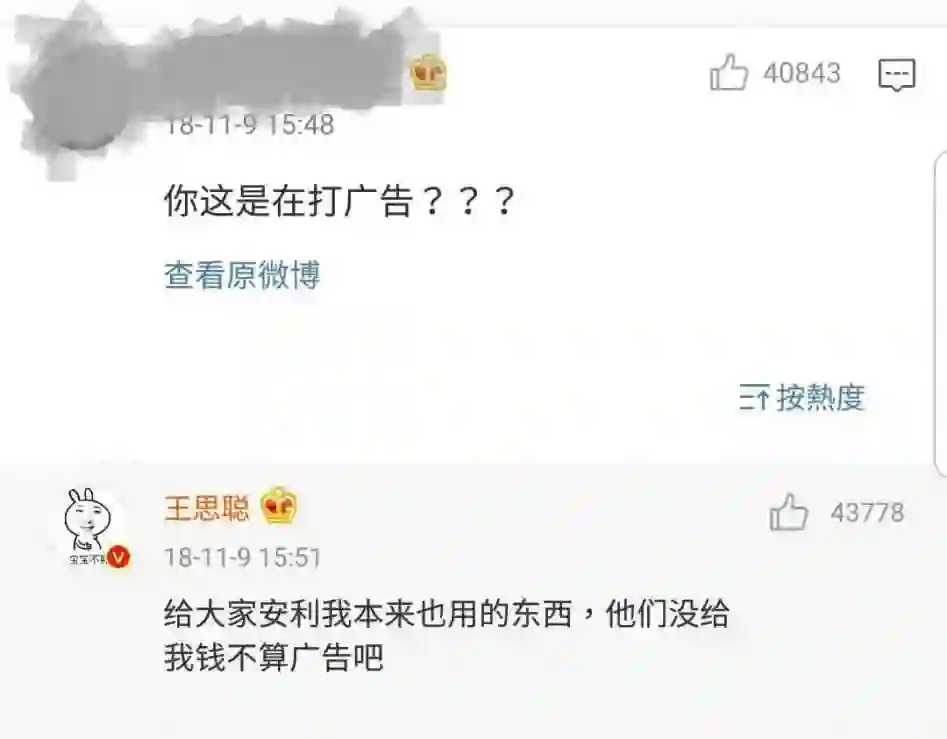 微博下方有网友质疑王思聪是否在打广告,他本人回应称,“给大家安利我本来也用的东西,他们没给我钱不算广告吧。”