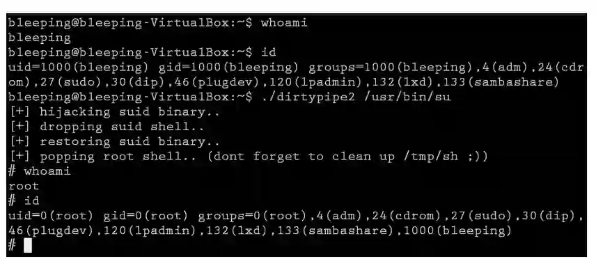 除了这个“Dirty Pipe”漏洞之外,还有一个漏洞被安全研究员BLASTY爆出,这个漏洞可以在Dirty Pipe的基础上更轻松地获得root权限,只需要一个简单的脚本即可,通过修补/usr/bin/su命令,在/tmp/sh处放下一个root shell,然后执行脚本,用户就可以获得root权限了。就像下面BleepingComputer在运行5.13.0-27-generic内核的Ubuntu 20.04.3 LTS中所展示的那样。