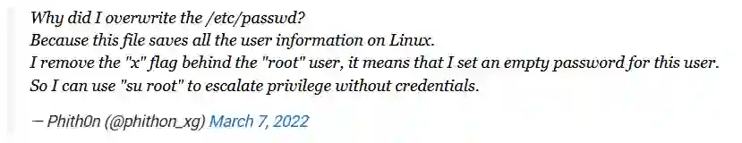 安全研究员Phith0n也向我们说明了如何使用该漏洞来修改/etc/passwd文件,使root用户的账户没有密码。这样做的结果是,非特权用户也可以非常简单的执行“su root”命令来获得对根账户的访问。