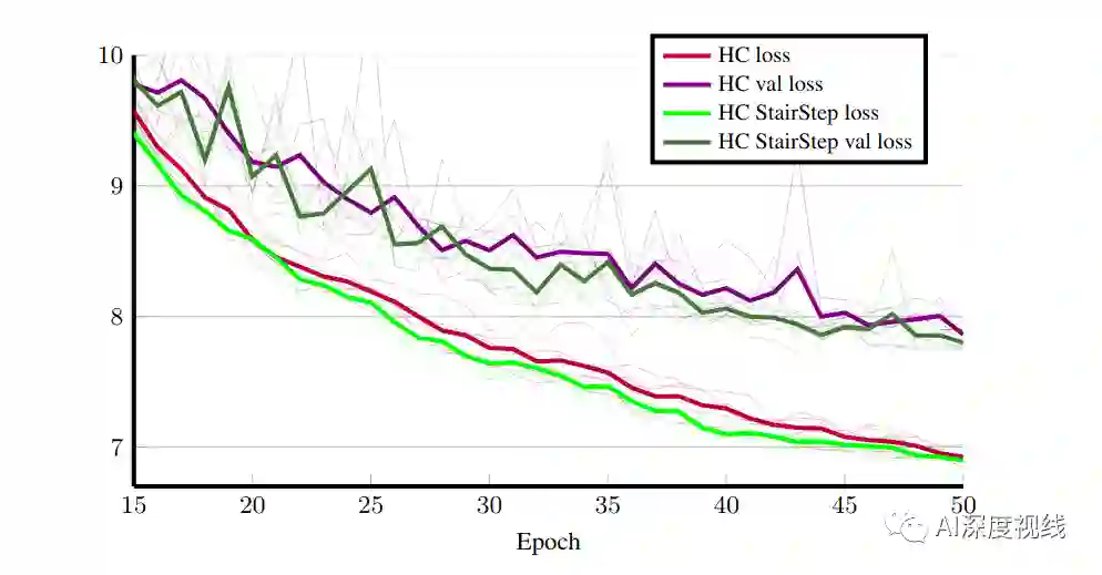 为了了解实际影响,进行了以下实验。从Cityscapes数据集中选了Poly-YOLO 200个训练图像和100个验证图像,用于hypercolmn中直接上采样和staircase。我们为两种方式各进行了五次训练,并在下图中绘制了训练进度图。从图中可以看出,差异很小,但是很明显,在hypercolmn中staircase插值产生的训练和验证损失略低,在相同的计算时间下得到了改进。