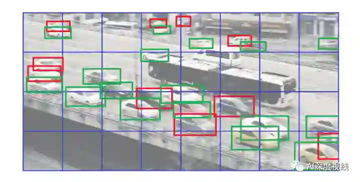 由于YOLO系列都是基于图像cell栅格作为单元进行检测,以416*416大小的图像为例,在图像分辨率随着卷积下降到13*13的特征图大小时,这时候特征图一个像素点的感受野是32*32大小的图像patch。而YOLOV3在训练时候,如果出现相同两个目标的中心位于同一个cell,那么前面一个目标就会被后面目标重写,也就是说两个目标由于中心距离太近以至于在特征图上将采样成为同一个像素点的时候,这时候其中有个目标会被重写而无法进行到训练当中。如下图所示,红色目标为因为重写而没有加入到训练中的目标,可以看到,在这样一个特征图上,重写的目标数量还不少,27个目标里有10个都被重写,特别是比较稠密的地方。