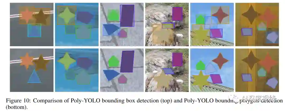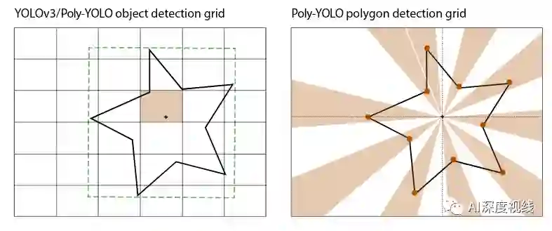 如果两个顶点属于同一个极坐标单元,则取与边界框中心距离较大的顶点。该图还显示了这种限制的实际影响。这不是训练或推理的问题,这是标签创建的问题;网络本身是经过正确训练的,并根据(不精确的)训练标签做出预测。在连接单个顶点之后,将第一个顶点与最后一个顶点连接起来,这可能会给强非凸对象带来问题。不过,这种行为不会在所有非凸对象上发生。如果两个顶点位于两个不同的极单元中,那么即使是非凸的目标也可以正确地处理,如下图所示,Poly-YOLO甚至可以很好地处理非凸的星星。