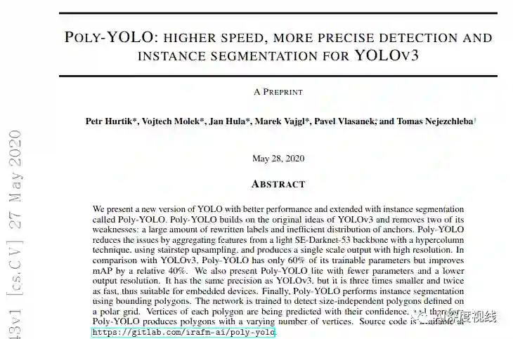本文提出了性能更好的YOLOv3新版本,并扩展了名为Poly-YOLO的实例分割。Poly-YOLO建立在YOLOv3的原始思想的基础上,并消除了它的两个弱点: