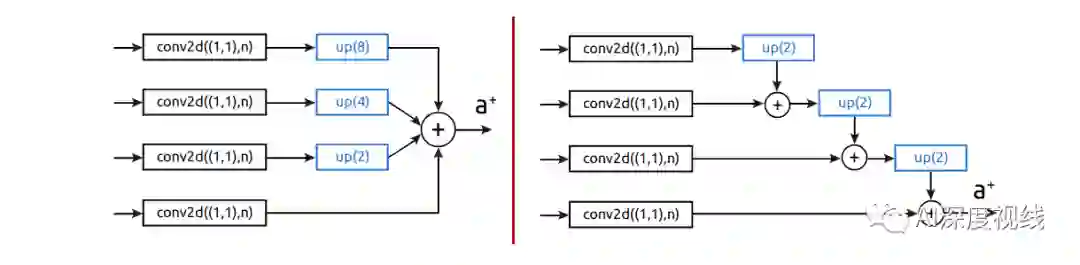 如果我们考虑最近邻上采样,O=O '保持不变。对于双线性插值(和其他),O/=O '用于非齐次输入。关键是,无论是直接上采样还是staircase方法,计算复杂度都是相同的。虽然staircase方法实现了更多的添加,但它们是通过分辨率较低的特征图计算的,因此添加的元素数量是相同的。