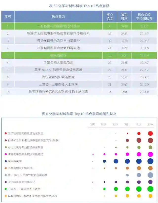 化学与材料科学领域 Top10 热点前沿主要分布在太阳能电池、有机合成、纳米技术、超级电容器、自由基聚合、上转换发光等领域。与 2013-2016 年相比, 2017 年 Top10 热点前沿既有延续又有发展。