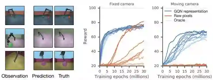 GQN 的表征为鲁棒、样本高效的强化学习带来了可能。把 GQN 的紧凑的表征作为输入,相比无模型的基准线智能体,目前顶级的强化学习智能体能够以更数据高效的方式进行学习,如下图所示。对于这些智能体来说,生成网络中编码的信息可以看做是存储了这些环境的「固有信息」、「通用特性」。