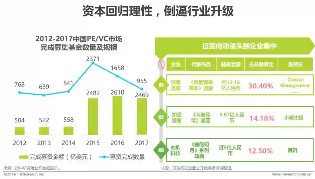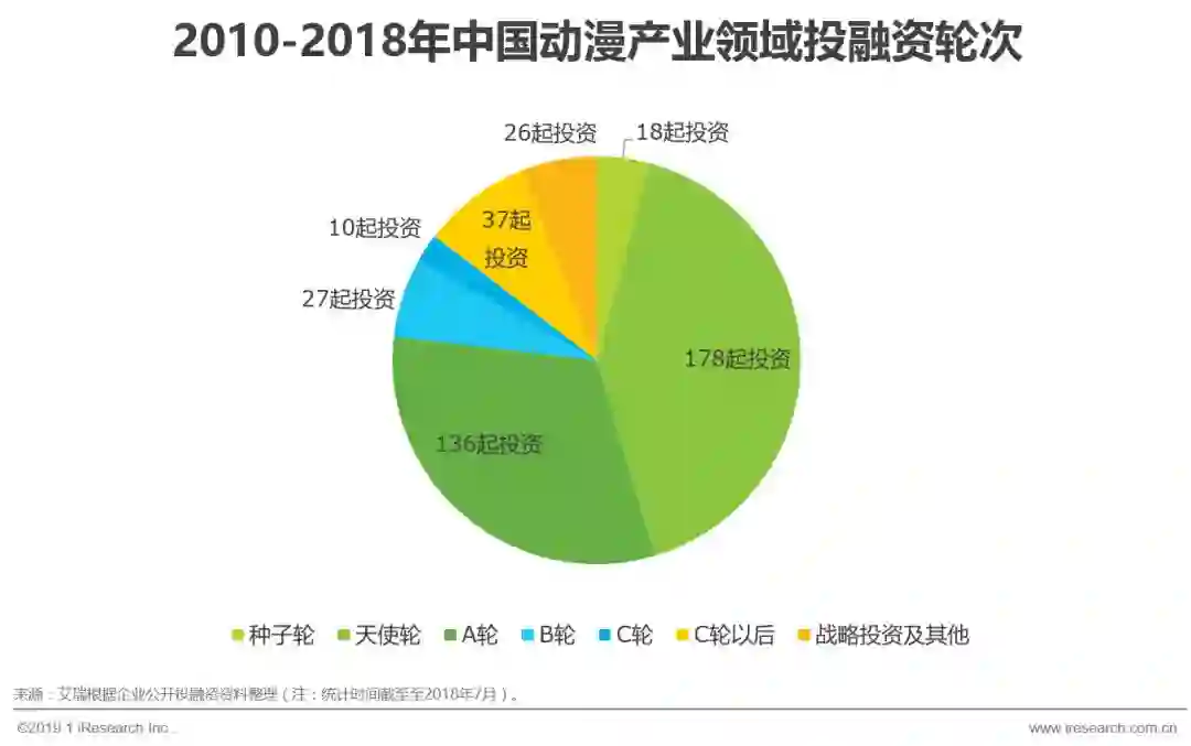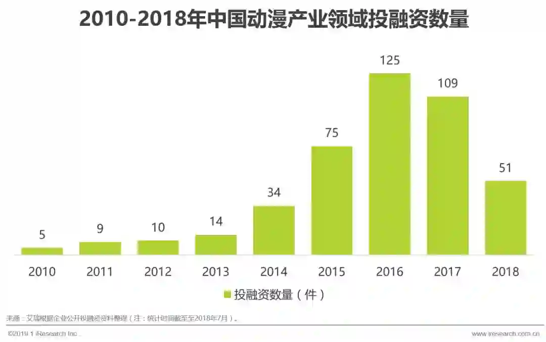 2015年以来,随着二次元用户的崛起以及大量盗版作品的下架,动漫产业公司开始大量受到资本的关注,2016年动漫产业的投融资行为达到了历史高峰。2017年初,在ACG联盟资金链断裂、布丁动画停止运营等消息的震荡之下,动漫产业在2017年进入一个短暂的调整期。之后,随着负面出清,市场动能充沛,动漫产业的融资披露频率重回正轨。但是,从总的趋势来看,2017年以来,虽然资本对动漫产业一直保持着持续的关注,但已不像最初遇到动漫项目就投资那么疯狂,资本开始渐趋冷静,不好的项目或者不好的企业因为拿不到投资被市场清理出去。