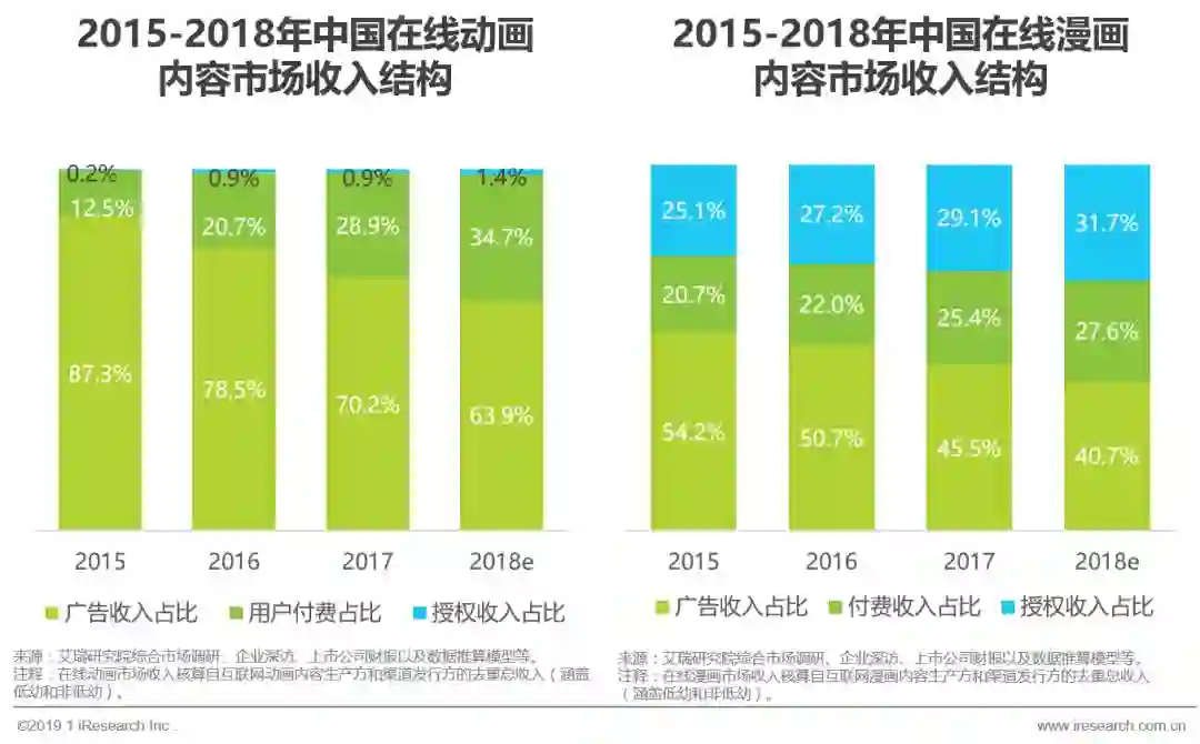 从近几年在线动漫内容市场的收入结构来看,在线动漫内容市场的收入来源主要包括内容付费、广告和衍生授权金三大块,但是动画市场和漫画市场的盈利侧重点仍然有所差异。在线动画内容市场的收入结构更接近于网络视频,受众进入门槛较低,内容播映带来的广告和用户付费收入占据总收入的绝大部分。在线漫画内容市场的收入结构则相对更加多元,受众更加小众,但也更加核心和忠诚,而且,漫画大多是原生IP,衍生开发价值巨大,因此衍生开发授权金在在线漫画市场中也占据着较大的分量。