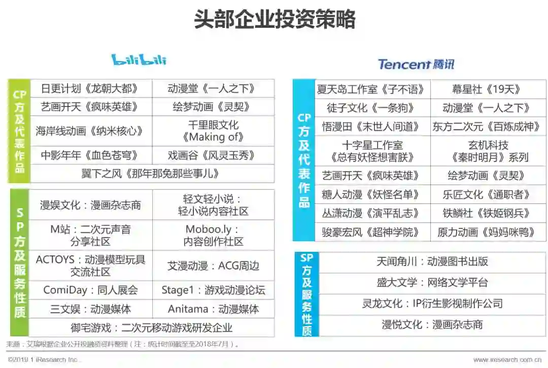 虽然动漫行业一直是投资关注的热门领域,但主要是战略投资者占主导地位。目前市场上活跃的投资者主要表现为腾讯、爱奇艺、网易、哔哩哔哩等平台类公司以及以光线传媒、万达传媒等为主的影视类公司。其中,哔哩哔哩和腾讯成为动漫行业投资的重要玩家,已经投资或入股多家具有IP生产能力或者动漫制作能力的企业。