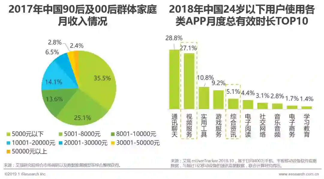 在90后和00后中,家庭月平均收入高达10676元。根据中国统计局发布的数据,2017年上半年全国居民家庭月平均收入为6250元,90后和00后的家庭收入高于全国居民家庭的70.8%。这群成长于相对优渥的物质条件中的年轻人,更乐意进行文化娱乐服务消费。根据艾瑞用户调研数据显示,中国的90后和00后人群规模达2.8亿多,文娱消费支出占总消费支出的28.9%,平均每天在网络娱乐上花费时间超过1.6个小时。艾瑞数据产品mUserTracker显示,在24岁以下用户中,视频服务和游戏服务类等在线娱乐产品已经占据了用户较多的时间,比例分别达到27.1%和9.2%。