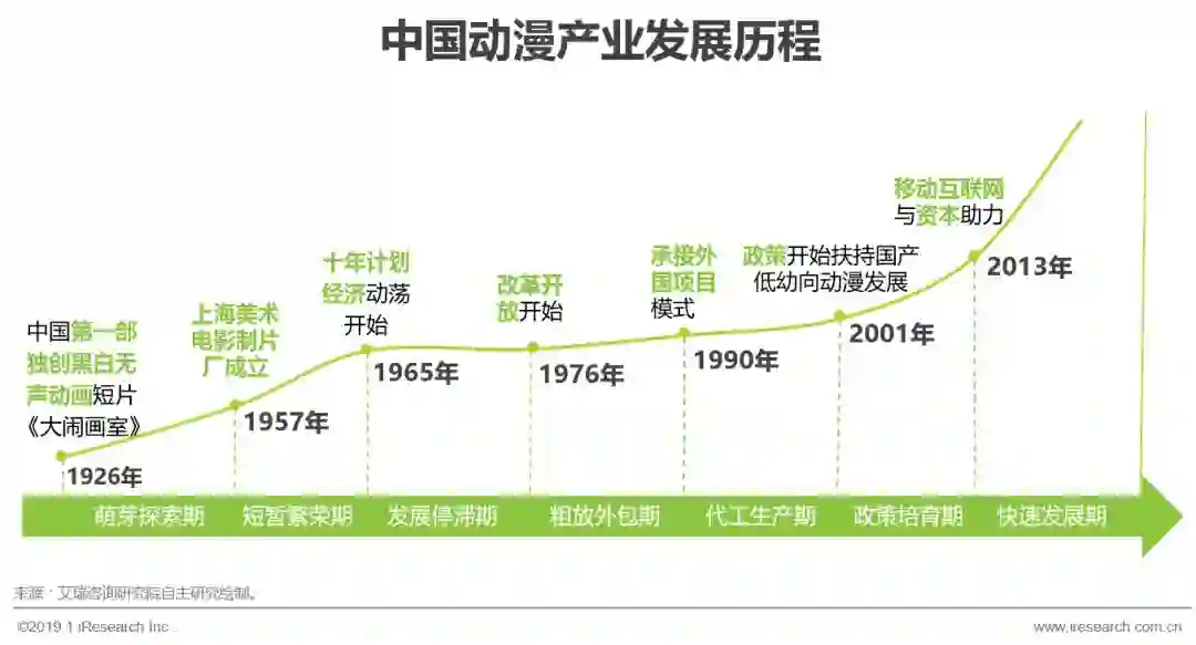 1926 年万氏兄弟打造了中国第一部独创黑白无声 10 分钟动画短片《大闹画室》, 助推1926-1945年中国动画进入萌芽探索期。此后,中国动漫产业的发展跟随着中国经济的发展起起伏伏,一直没有特别大的突破,直到2013年以来得益于移动互联网的发展和普及,互联网巨头们纷纷进入动漫产业布局,腾讯、网易等在文娱产业的资本投入助推中国动漫产业的逐渐发展,2013年中国动漫产业逐渐进入快速发展期。