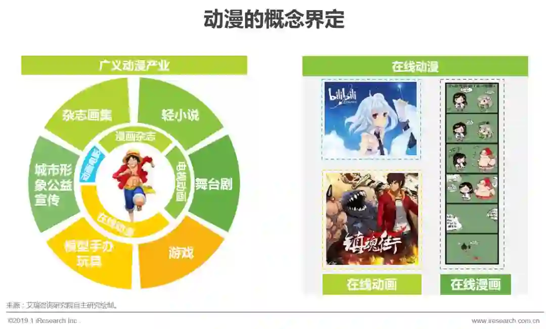 动画(animation)和漫画(cartoon)均是指通过制作,使一些有或无生命的东西拟人化、夸张化,赋予其人类的一切感情、动作,或将架空的或者现实的场景加以绘制,使其画面化。漫画是一种艺术形式,是用简单而夸张的手法来描绘生活或时事的图画;而动画是一种综合艺术,它是采用逐帧拍摄对象并连续播放而形成运动的影像。按照载体的不同,可以将动漫划分为在线动漫、电视动画、漫画杂志和动画电影等四大类。本研究重点针对的对象是在互联网平台上播放的动画或者连载的漫画。动漫产业则主要指以动画和漫画为表现形式,包含动漫内容产品的开发、生产、出版、播出、演出和销售。