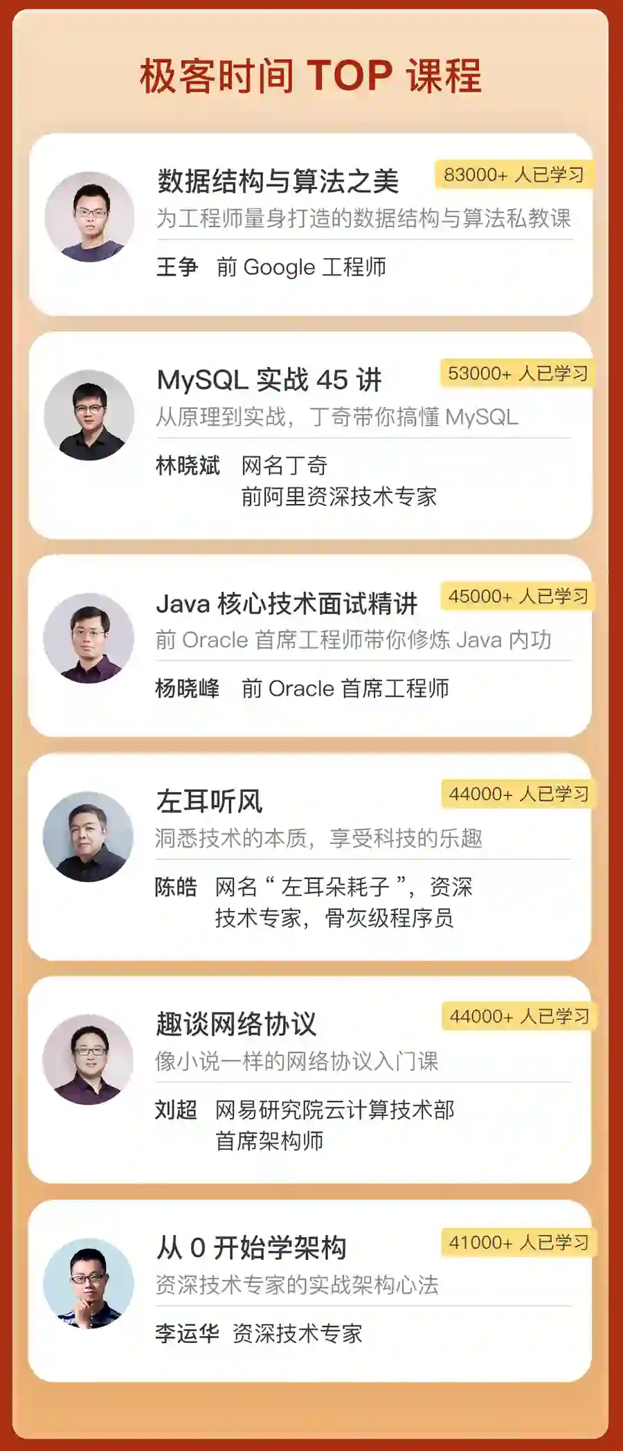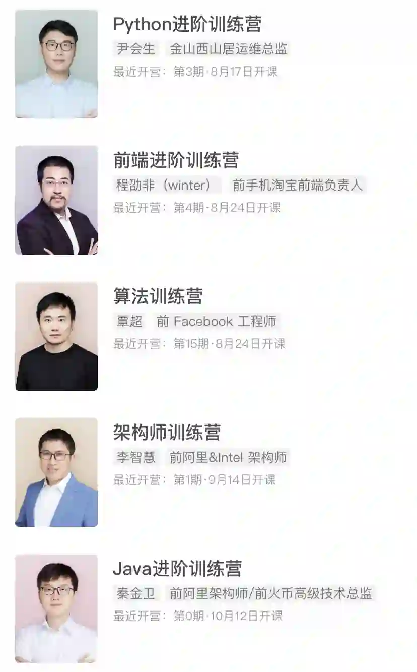 极客时间的导师来自 BAT、Google、Facebook、Intel 等国内外一线互联网企业,均为拥有丰富技术实战经验的资深技术专家。在课程中,导师们会从问题为出发点,将核心知识与实际应用结合起来,让你学完能解决实际中的问题,提高研发效能。
