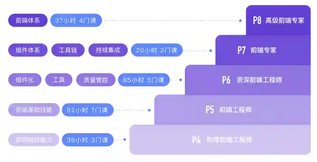 除了建立基于岗位的知识体系之外,还全方位支持“自驱学习”。极客时间为你设计了清晰高效的“阶梯式学习”方案,如下图:前端工程师的阶梯能力建设方案。