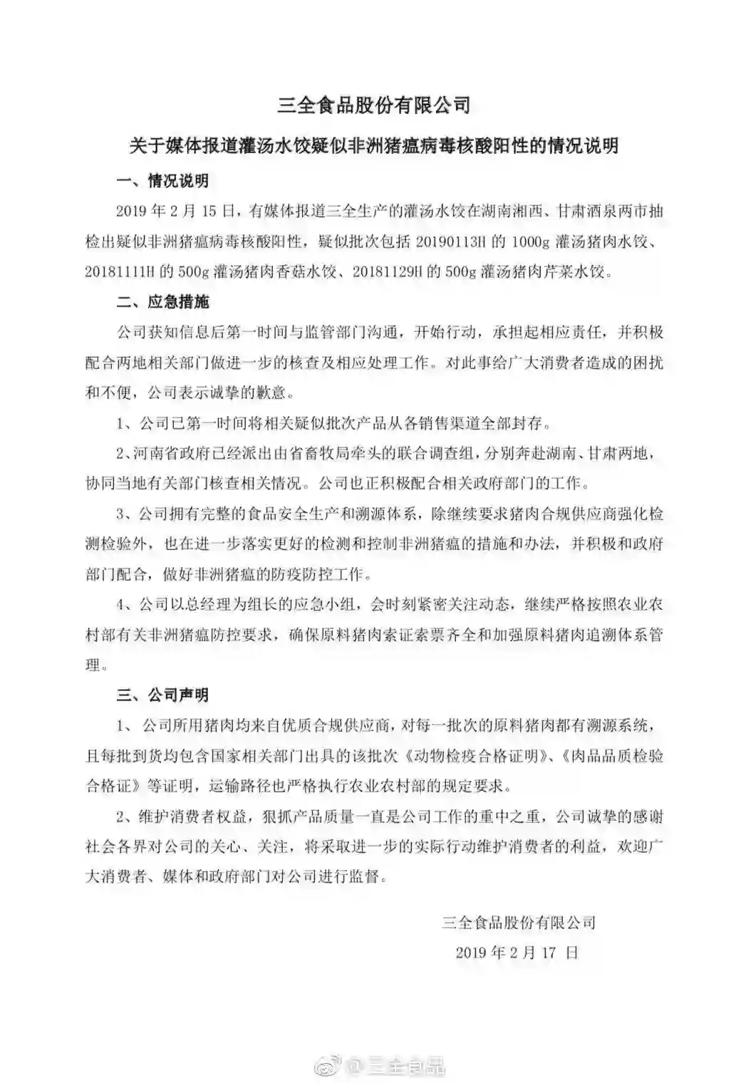 针对媒体报道灌汤水饺疑似非洲猪瘟病毒核酸阳性,三全食品 2 月 18 日早间披露公告称,公司已第一时间将相关疑似批次产品从各销售渠道全部封存;河南省政府已经派出由省畜牧局牵头的联合调查组,分别奔赴湖南、甘肃两地,协同当地有关部门核查相关情况。公司也正积极配合相关政府部门的工作。三全食品声明称,公司所用猪肉均来自优质合规供应商,对每一批次的原料猪肉都有溯源系。