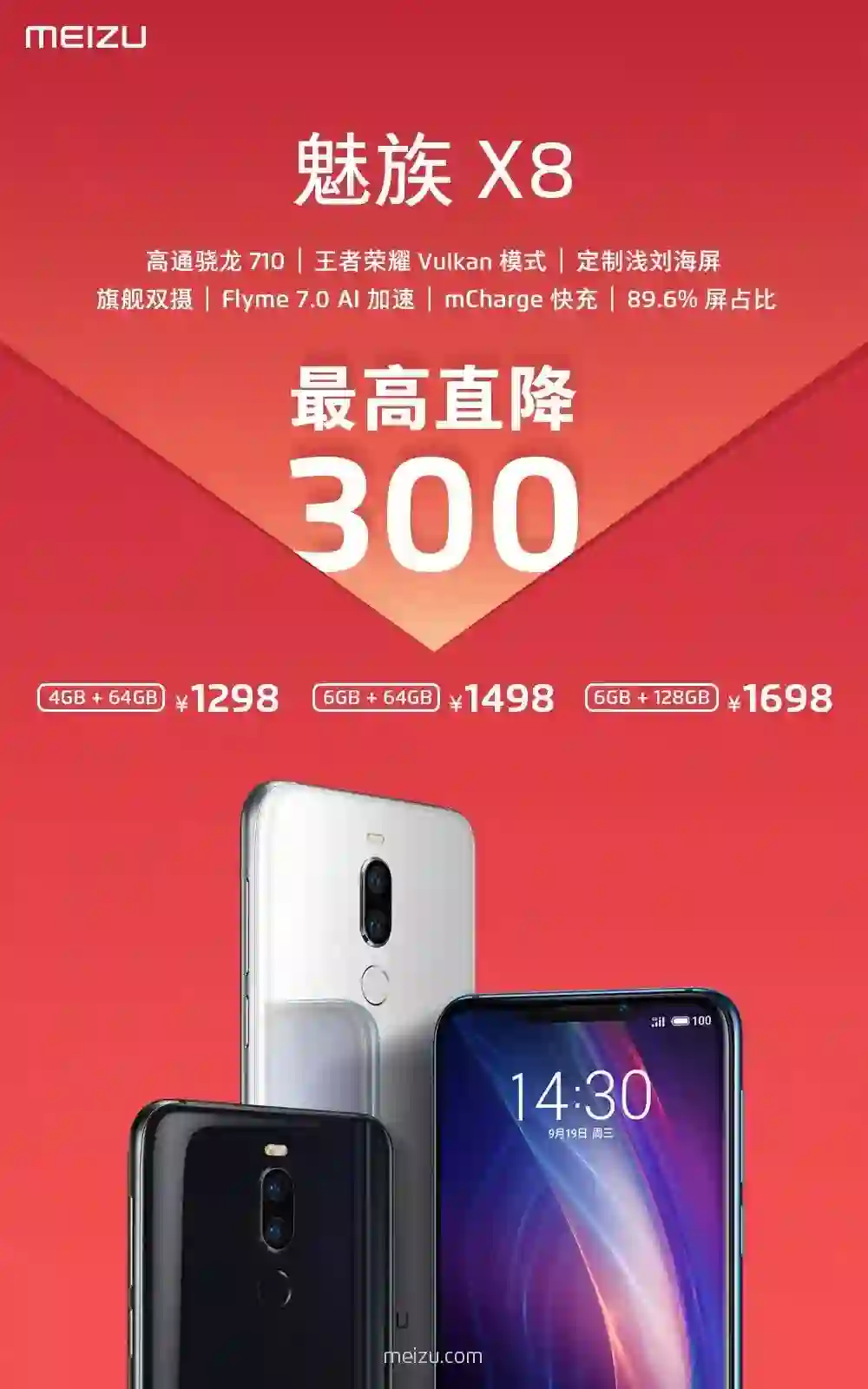 今天,魅族 X8 官方宣布降价,4+64GB 从原来的 1598 元降到 1298 元,6+64GB 从原来的 1798 元降到 1498 元,6+128GB 从 1998 降到 1698 元。降价的魅族 X8 可能是最便宜的骁龙 710 手机了。